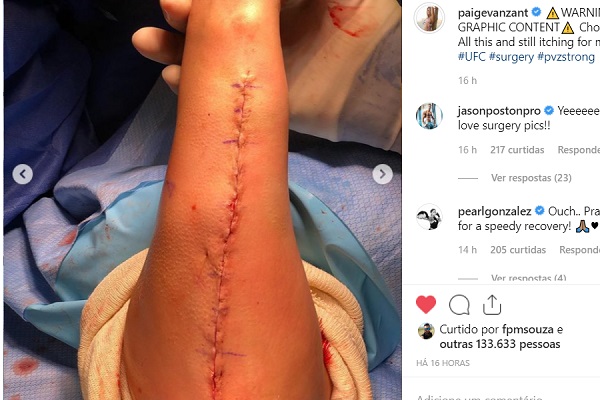 Através de publicação em seu perfil no Instagram (veja abaixo ou clique aqui), VanZant mostrou registros feitos durante a cirurgia. Em alguns deles, é possível observar a placa de metal que os médicos inseriram, que vai de uma ponta a outra do antebraço da peso-mosca (57 kg) americana. Em outro dos cliques compartilhados, ela posa ao lado do marido – também lutador -, Austin Vanderford.