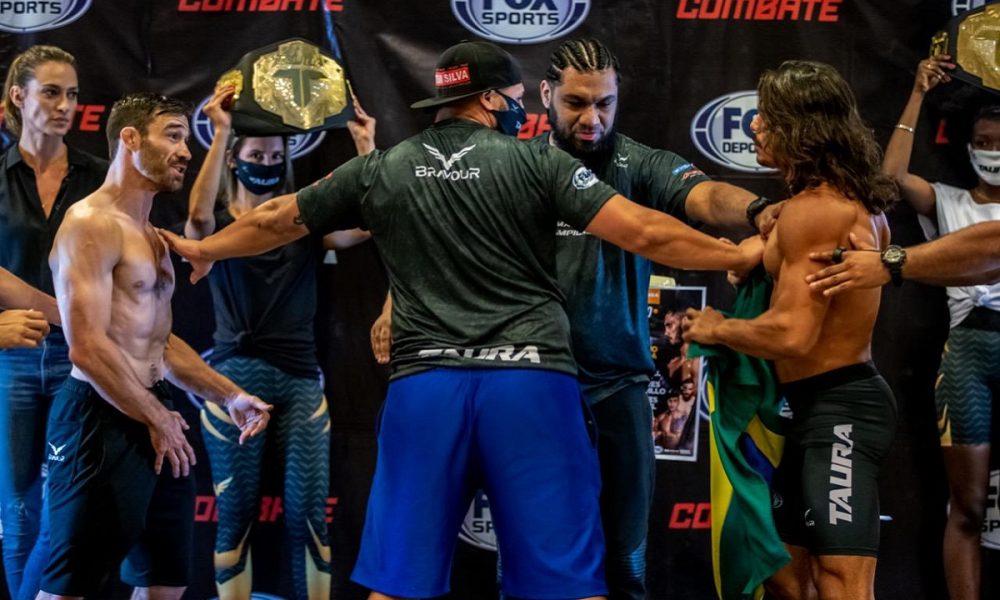Na última quinta-feira (22) foi realizada a pesagem oficial do Taura MMA 10, que acontece nesta sexta-feira, no Rio de Janeiro (RJ), e o clima esquentou quando os atletas da co-luta principal da noite fizeram a encarada. Depois de muita provocação, Ary Farias e Johnny Campbell, que disputam o título interino peso-galo (61 kg), trocaram ofensas e empurrões e foram separados por membros da franquia.