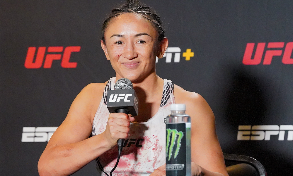 Carla Esparza parece disposta a se consolidar como desafiante número um no peso-palha (52 kg). No UFC Vegas 27, evento realizado no último sábado (22), a americana foi dominante ao nocautear Yan Xiaonan, conquistou a quinta vitória seguida e se aproximou de disputar o título da divisão. Empolgada, ‘Cookie Monster’, que pediu para enfrentar a campeã da categoria na coletiva de imprensa, repetiu o ato.