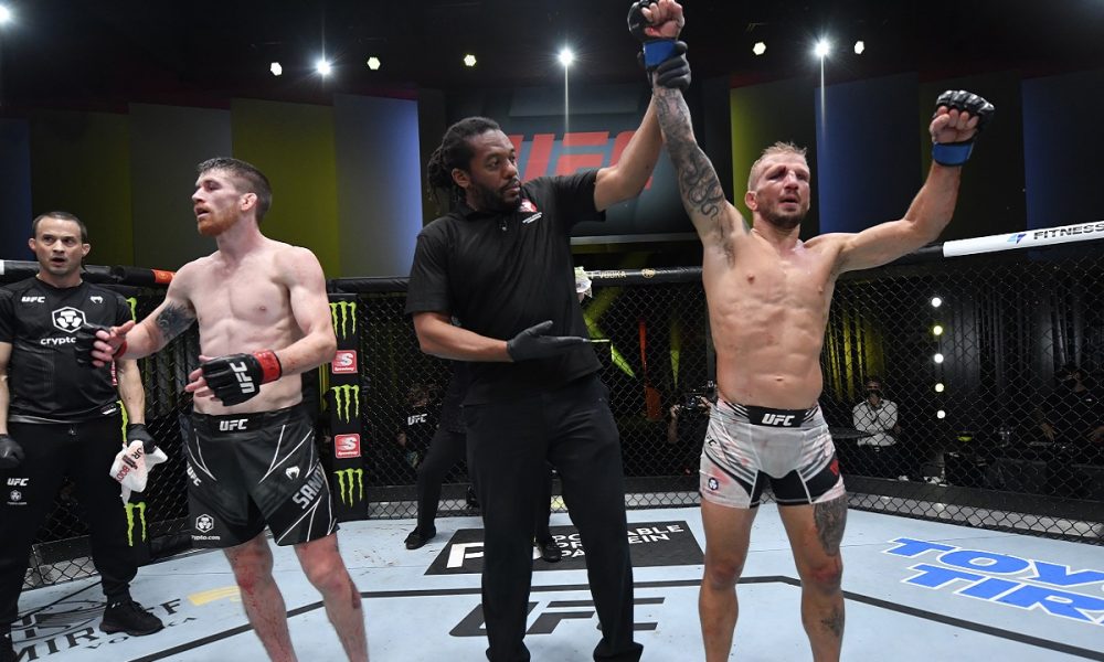 O UFC Vegas 32, realizado no último sábado (24), marcou o retorno de TJ Dillashaw à organização. Suspenso por dois anos após ter sido flagrado em teste antidoping, ex-campeão do peso-galo (61 kg) mediu forças diante de Cory Sandhagen e saiu vitorioso por decisão dividida dos jurados, após cinco rounds bem equilibrados. Quem acompanhou de perto este combate e elogiou a atuação do americano foi Urijah Faber.