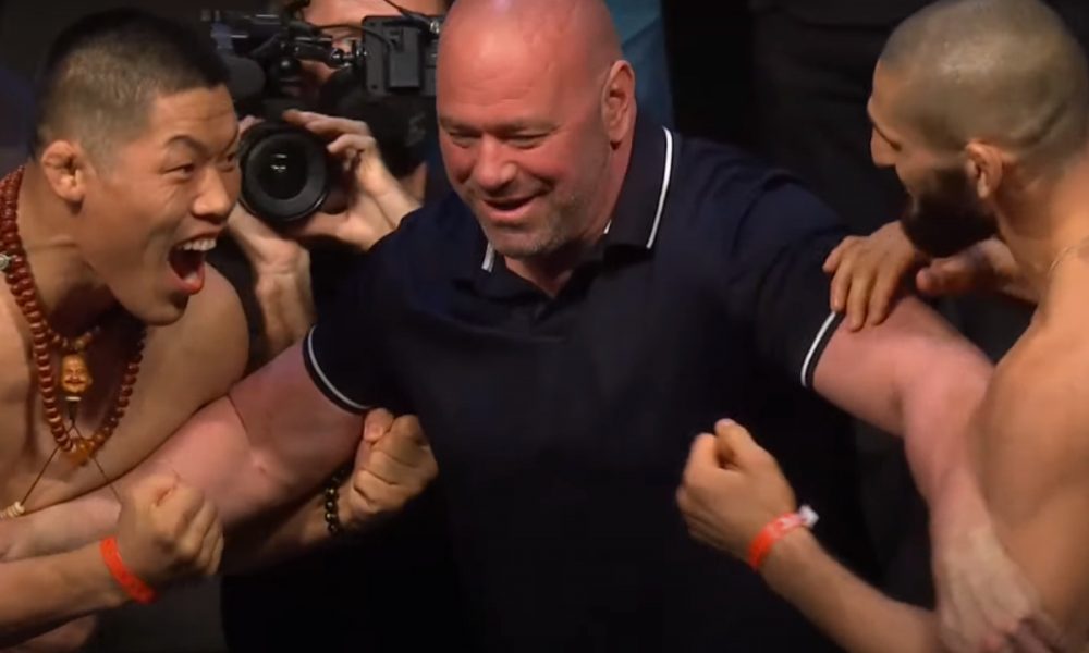 Encarada entre Chimaev e Jingliang rouba a cena na pesagem cerimonial do UFC 267