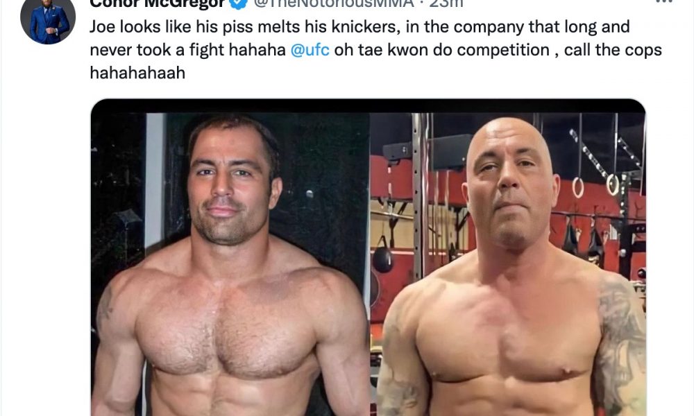 Ao saber da postura de Rogan, que afirmou que sua urina “derreteria o copo da USADA”, Conor rapidamente respondeu através de suas redes sociais. Na mensagem, o irlandês ironiza o físico do comentarista com imagens de seu porte físico tanto aos 25 como aos 52 anos, sempre em forma.