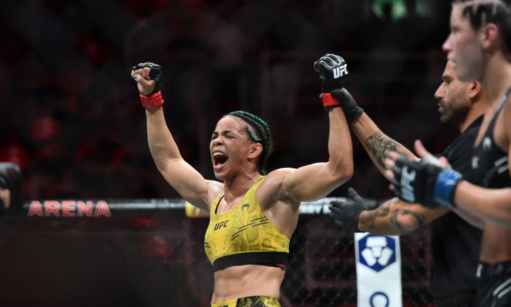 “Boa noite, Brasil! Acho que fiz o suficiente para trazer a vitória. Impus meu jogo, meu ritmo. Com certeza acho que fiz o suficiente para conquistar essa vitória. Kings MMA, hey! É uma academia de muay thai, fui para lá melhorar meu striking. Sou faixa preta de judô e jiu-jitsu, mas sei botar mão também”, declarou a pernambucana, ainda no octógono.