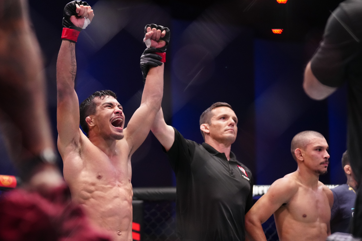A seguir, Kaynan precisou de pouco menos de três minutos para dominar o americano Dylan Mantello. Depois de acertar os melhores golpes em pé, o veterano de 32 anos levou para o chão e apagou o rival com um justo estrangulamento. Triunfo rápido e contrato garantido!