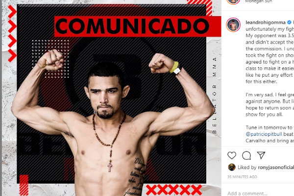 “Oi pessoal. Infelizmente, minha luta foi cancelada. Meu oponente pesou 1,5 kg a mais e não aceitou o acordo da comissão atlética. Entendo que ele aceiotu a luta com pouco tempo, mas nós concordamos de lutar em uma categoria de peso acima para ser mais fácil. E não vi ele se esforçando para bater o peso”, provocou o brasileiro.