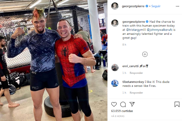“Tive a chance de treinar com essa espécime humana hoje na Tristan Gym! Johnny Walker é um lutador maravilhosamente talentoso e um grande cara”, escreveu Georges St-Pierre na legenda da foto publicada com o brasileiro.