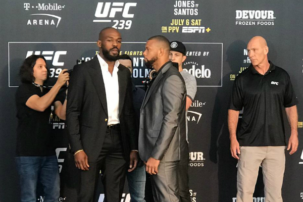 Pela primeira vez em Las Vegas (EUA), os lutadores do card do UFC 239, evento programado para este sábado (6), ficaram frente a frente para as tradicionais encaradas que compõem o media day. E como destaque, o americano Jon Jones, campeão dos meio-pesados (93 kg), deu show de sangue frio e jogo mental para praticamente ignorar a presença de Thiago ‘Marreta’, que estava a centímetros de distância.