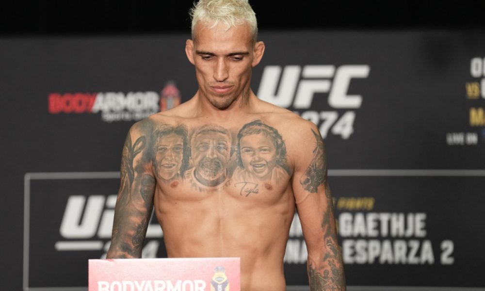 Estrela principal do card do UFC 274, o brasileiro Charles ‘Bronx’ liderou a pesagem oficial realizada nesta sexta-feira (6) na cidade de Phoenix (EUA). Com a marca de 70.5 kg, o campeão dos pesos-leves, último a se pesar, estourou o limite da categoria em pouco mais de 220 gramas. Assim que registrou a marca, o atleta recebeu uma hora extra para atingir o peso exigido.