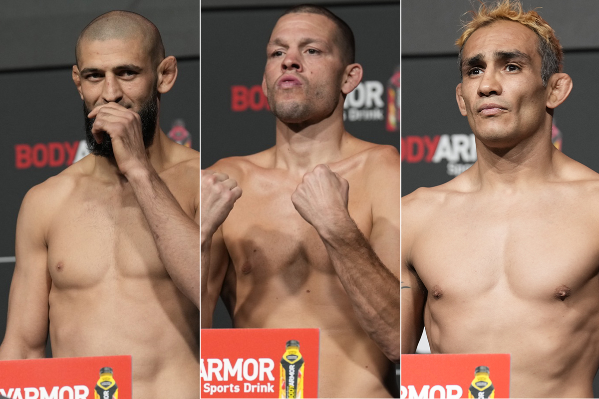 Mesmo assim, Nate Diaz e Khamzat Chimaev, então protagonistas do main event, não tiveram momentos de tranquilidade com a balança. Enquanto o americano cravou o limite da divisão dos meio-médios com rosto abatido, inclusive utilizando a libra de tolerância para atingir a marca de 77.5 kg, o rival checheno passou longe do limite e bateu 81 kg.