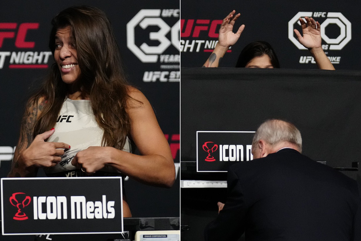 Em busca de sua primeira vitória no UFC, Istela Nunes, com 52.4 kg, encara a estreante russa Viktoriia Dudakova, que subiu na balança com 200 gramas a mais, em confronto que pode valer o seu emprego na organização. Por fim, Melquizael Costa registrou 66.2 kg para o duelo contra Austin Lingo, que registrou 200 gramas a menos na balança.