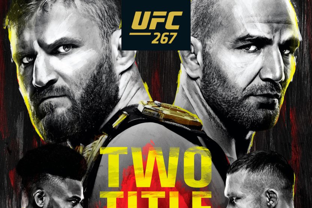 O pôster oficial do UFC 267, que acontece no próximo dia 30 de outubro, em Abu Dhabi (EAU), foi divulgado pela organização, através de suas redes sociais (veja abaixo ou clique aqui), na última quinta-feira (16). O destaque da arte ficou por conta das duas disputas de título agendadas para o evento, que colocarão em jogo os cinturões meio-pesado (93 kg) e peso-galo (61 kg) da entidade.