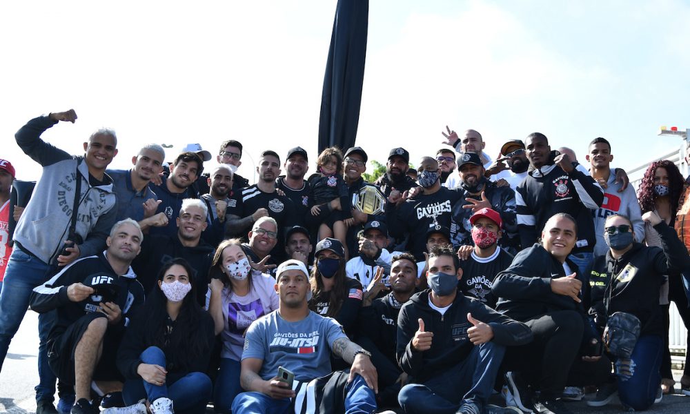Assim como já havia acontecido no embarque de Charles ‘Do Bronx’ para os Estados Unidos, a ‘Gaviões da Fiel’, principal torcida organizada do Corinthians, time de coração do lutador, esteve presente no aeroporto de Guarulhos, em São Paulo, no retorno do agora campeão peso-leve (70 kg) do UFC ao Brasil. Recebido com festa por seus ‘irmãos de camisa’, o atleta da equipe ‘Chute Boxe Diego Lima’ também pôde matar a saudade de sua família, especialmente de sua filha Tayla, que aguardava a chegada do mais novo detentor de cinturão do Ultimate.